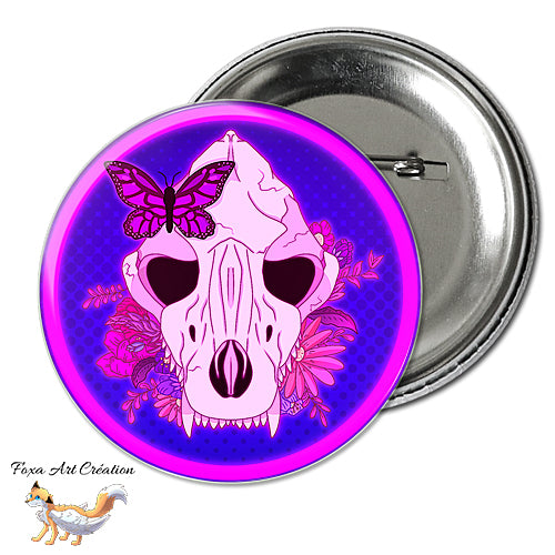Badge à épingle, Magnet aimanté pins Crâne de Canidé Floral, Papillon, Bleu et Rose Néon