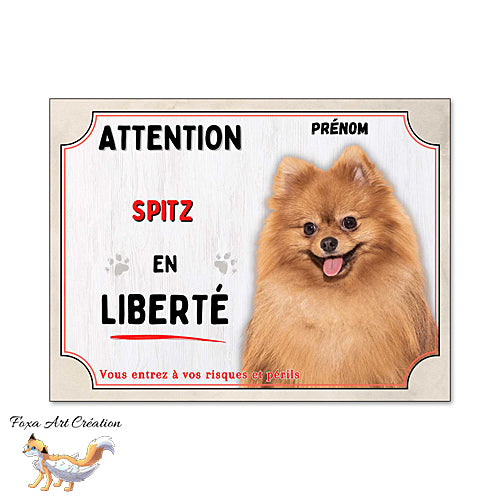 Plaque Attention Spitz en liberté panneau chien pancarte