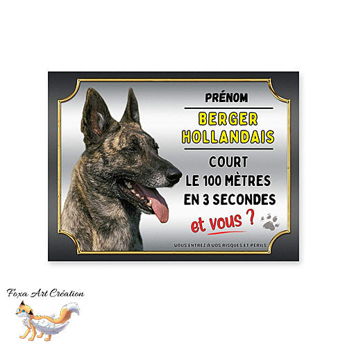 Plaque Attention au chien race Berger Hollandais cours le 100 mètres en 3 secondes et vous. Panneau de portail pancarte je monte la garde personnalisable.